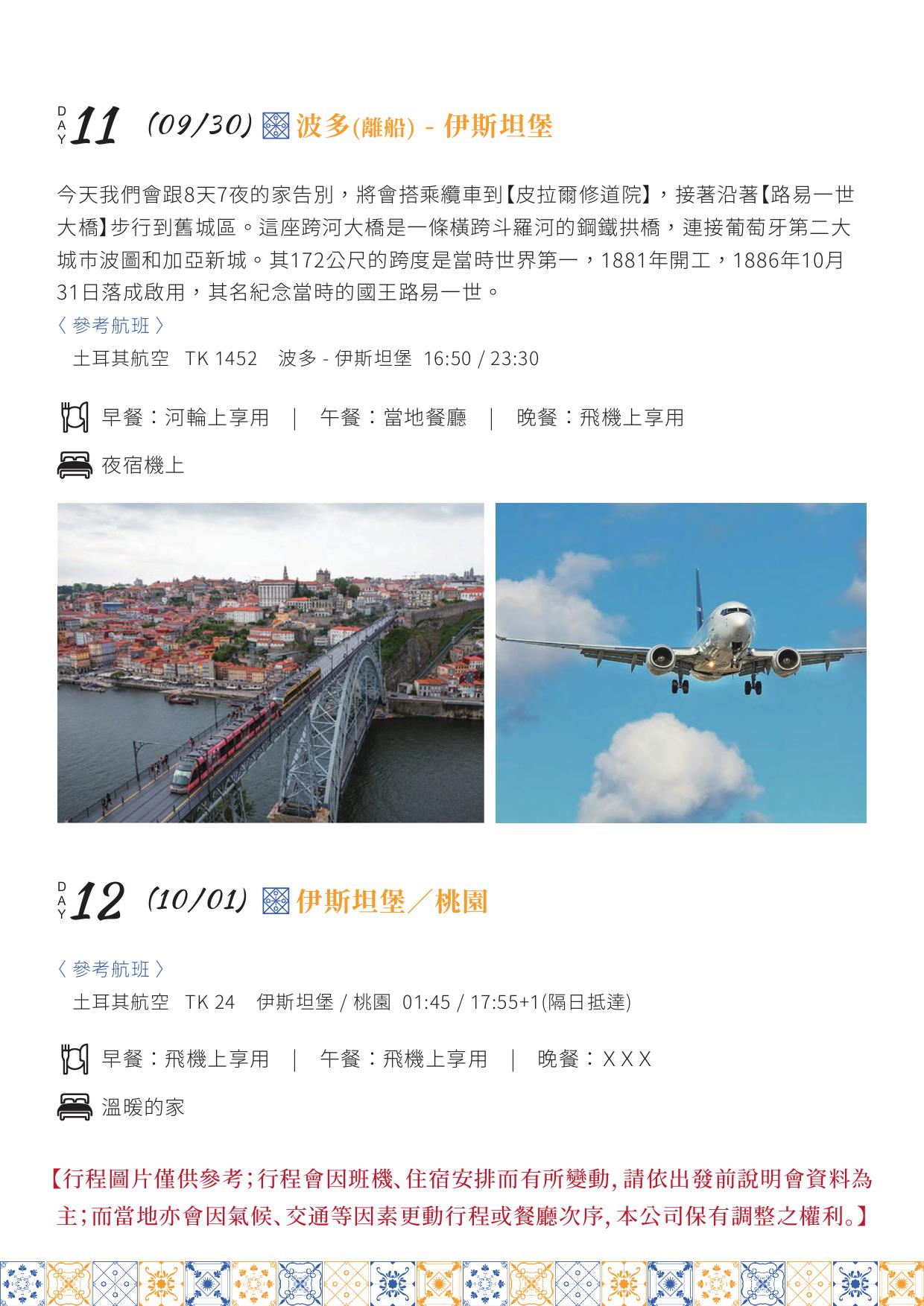 12. 本行程之飯店及航空公司之確認,視當地節慶保有調整之權利,若遇商展或節慶,將會尋找同等級替代飯店及住宿點,敬請包涵。